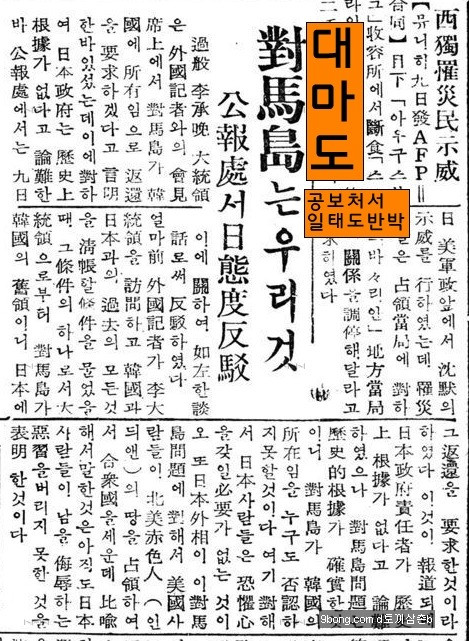 과반 이승만 대통령은 외국기자와의 회견석상에서 대마도가 한국에 소유임으로 반환을 요구하겠다고 언명한바 있섰는데 이에 대하여 일본정부는 역사상근거가 없다고 논란한바 공보처에서는 구일(九日)에 관하여 여좌한 담화로써 반박하였다.
