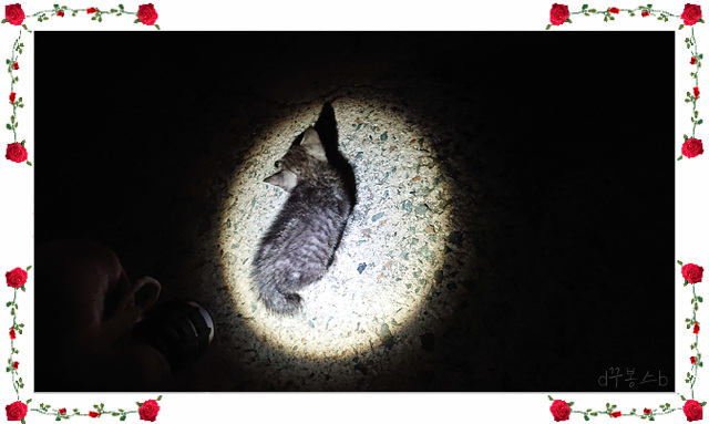 구봉산 둘레길을 잠시 돌고 내려오는 길에 아가씨 두명이 서 있더군요..뭘하는건지~~~ 지나가는데 차량밑에서 야옹이 울음소리가 들리더군요..혹시나 해서 후레쉬로 비춰 봤는데 아기냥이었습니다....그제서야 뒤에 서 있던 아가씨들이 '어~나온다 나온다' 아하~~ 아가씨들은 길냥이 밥을 주고 있었던거죠....