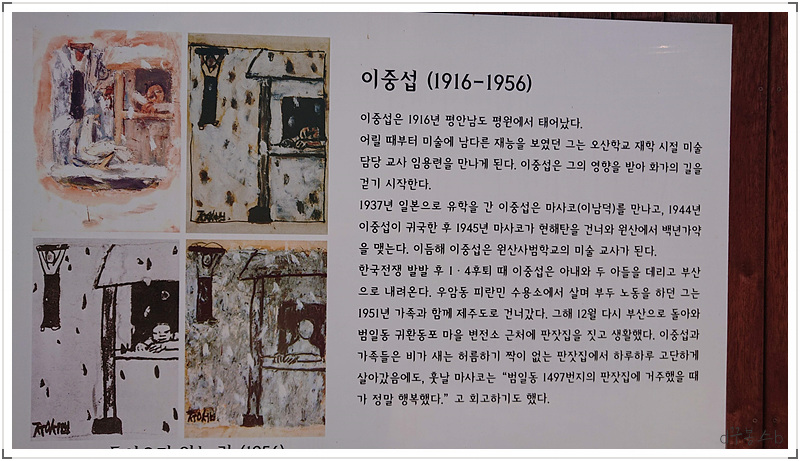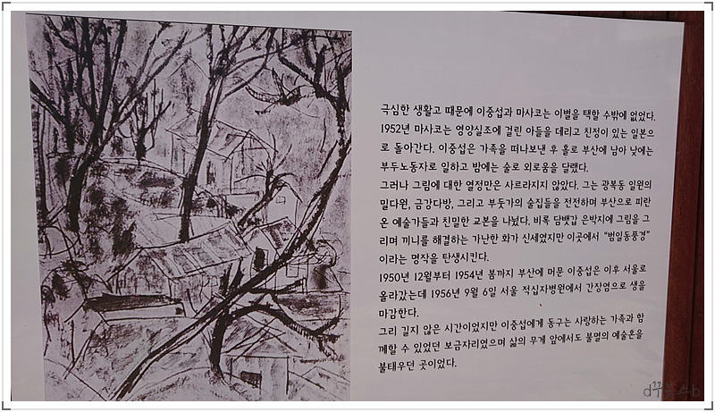 한국전쟁발발 후 1·4 후퇴 때 이중섭은 아내와 두 아들을 데리고 부산으로 내려온다. 우암동 피란민 수용소에서 살며 부두 노동을 하던 그는 1951년 가족과 함께 제주도로 건너갔다. 그해 12월 다시 부산으로 돌아와 범일동 귀환 동포 마을 변전소 근처에 판잣집을 짓고 생활했다.