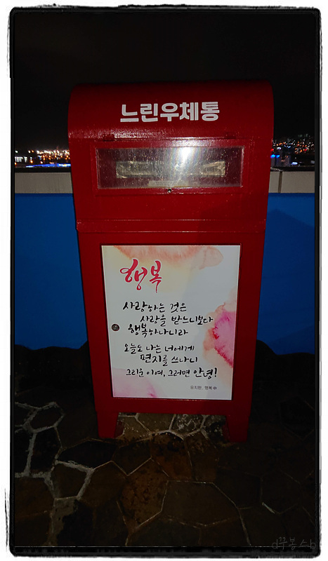 ▨ 아마 우체통에 바로 넣는다고 가는 게 아니라 엽서 쓰는 곳이 있습니다. 그곳에 가서 써야 1년 뒤에 올 거예요.ㅎ 정말 죄송합니다.. 사실 확인도 없이 포스트를 작성해서 너무 성의 없어 보이네요. 무조건 낮에 가세요. 갤러리 구경도 하고 나름 경치도 좋습니다.^^