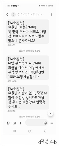 | ▶ 첫번째 문자 받고 혹시나 해서 그 동안 무료로 주던 로또 번호를 하나하나 적어뒀습니다. 한방에 로또 3등이 되던게 어찌된게 로또 5등도 안나오는겁니다. 그렇지 뭐~ 첫번째 문자 받았을때 답장 문자한게 왜 큰 실수였냐면~ 그 이후 로또 문자가 막 날라오는겁니다...음~~ 이 인간이 내 번호를 팔았나??? 그러다 오늘 월요일에 받은 문자 보고 이제서야 알겠더군요... 1.저한테 로또 문자 보낸 사람들 전부 한 사람입니다!!! 2.로긴을 안한 경우입니다. 사이트에 접속하면 반드시 접속기록이 남습니다. 저는 문자 받고 사이트에 접속한적 없습니다.첫번째 문자 받고 계속 안들어가다 번호 확인차 접속을 시작했고요...두번째 문자 또한 접속을 안했습니다.. 로긴을 안한 사람들 대상으로 업자가 낚시질을 한거죠..3등 당첨번호 애시당초 없었던거고 이후에 당첨번호 뜨고 자기가 보낸 번호 조작을 한겁니다. 이렇게 쉽게 3등 된다고?? 첫번째 문자 받고 2개월동안 접속해서 번호 확인했는데 5등도 없어요..당연 구매도 안했죠. |