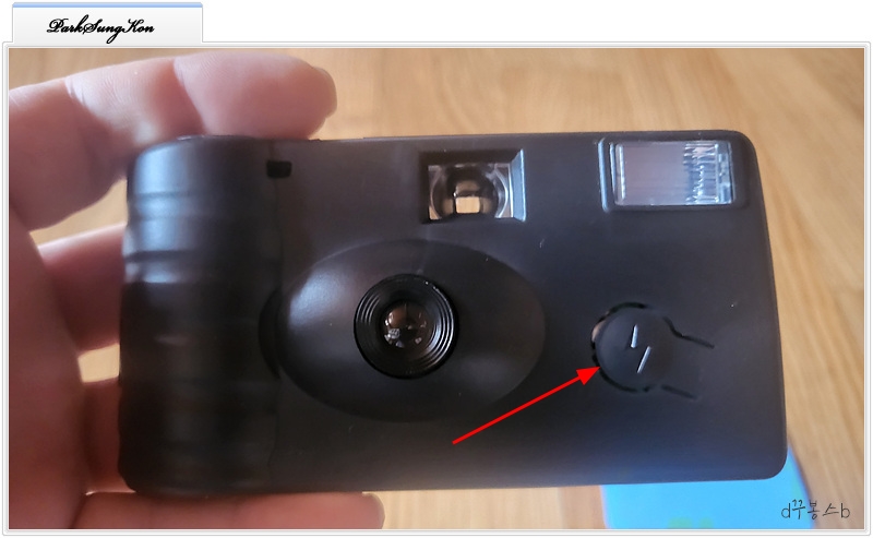 일회용 필름 카메라라고 해도 플래시가 있습니다.. 와~우 ~ 카메라 앞쪽 N 자 저기를 누르면 상단부에 빨간 불이 들어옵니다. 셔터를 누르면 번쩍하고 켜져요. 재미있더군요. 카메라 표면 종이는 안 뜯어도 되는데 제가 몰라서 뜯어 버렸어요.