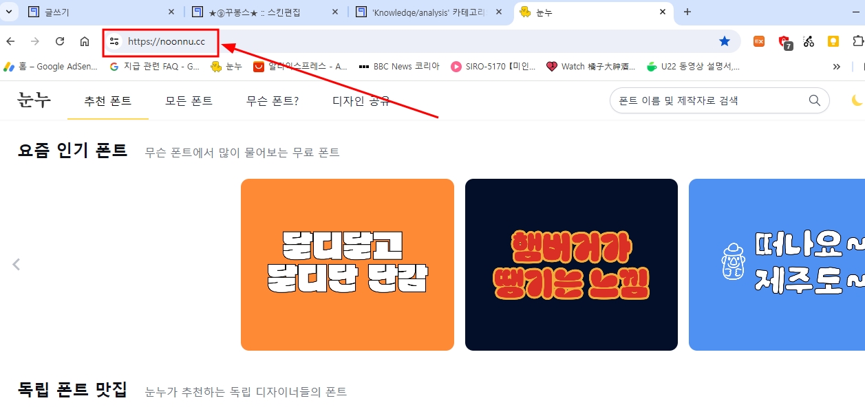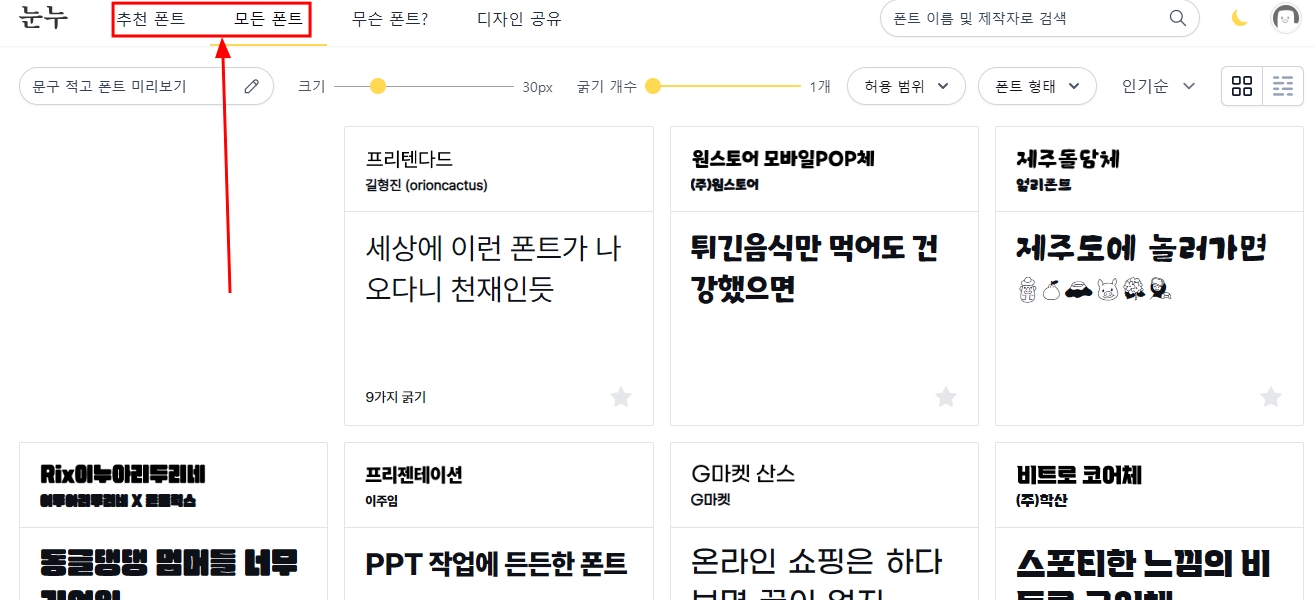 ↑↑ 추천 폰트가 있고 모든 폰트가 있습니다... 폰트체 쭈~욱 구경하면서 마음에 드는 걸 선택하세요.