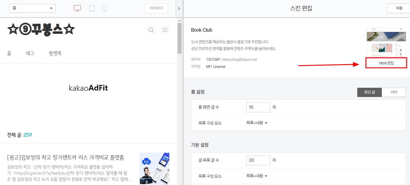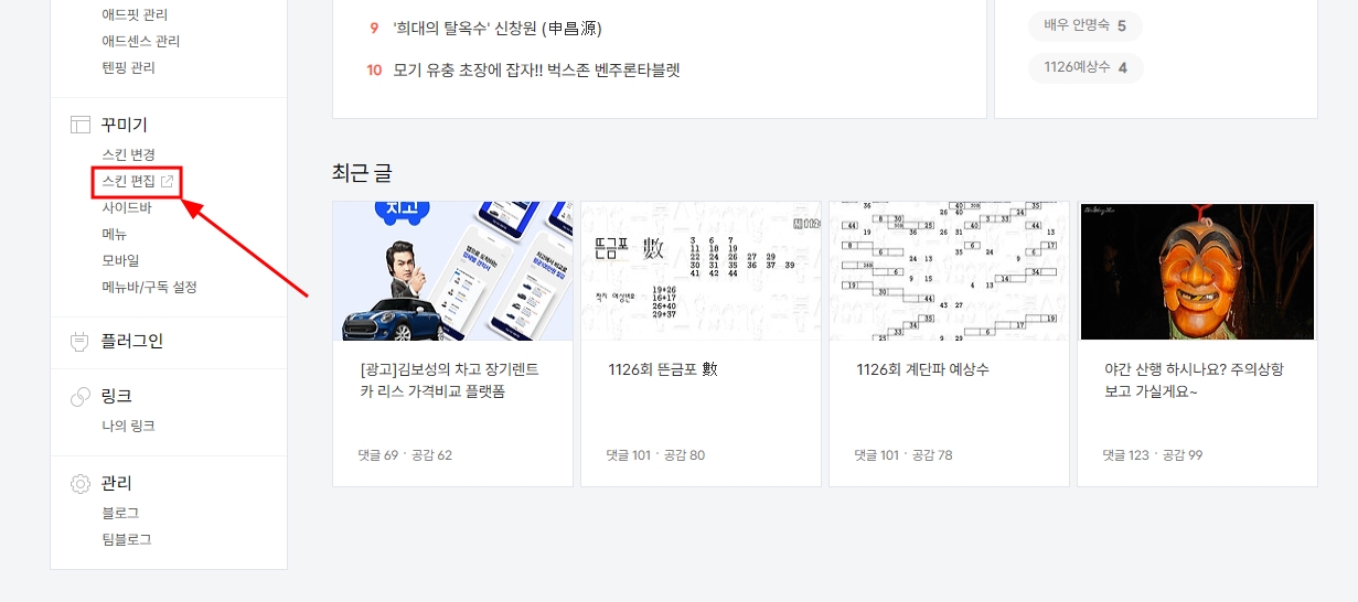 ↑↑ 본인 블로그 '설정'에 들어가서 꾸미기-스킨편집을 클릭합니다.