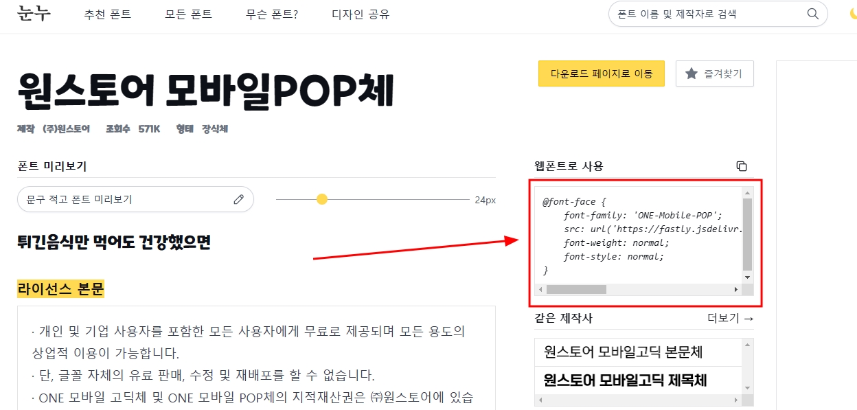 ↑↑ 마음에 드는 폰트체가 있으면 클릭해서 들어가 보면 제일 중요한 곳이 있죠..'웹폰트로 사용' @font-face { 전체를 복사하기 합니다.