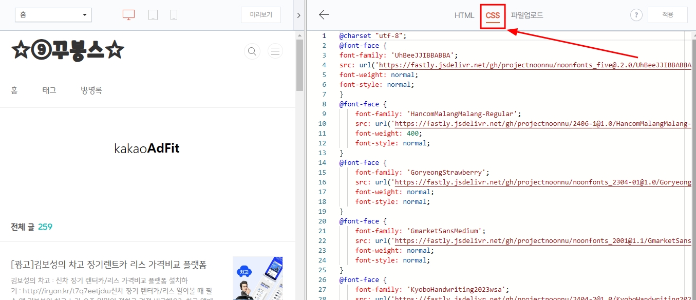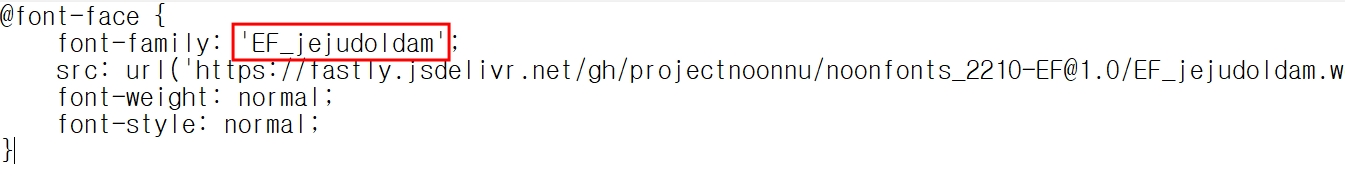↑↑ 위 이미지에서 EF_jejudoldam 이 폰트명입니다.. 이걸 사용하라는 겁니다. 그러면 다 된 거죠...메모장 내용을 복사해서 css에 넣어주고 저장.. 본인 블로그 확인해 보시면 본문 폰트체가 바뀌었을 겁니다.