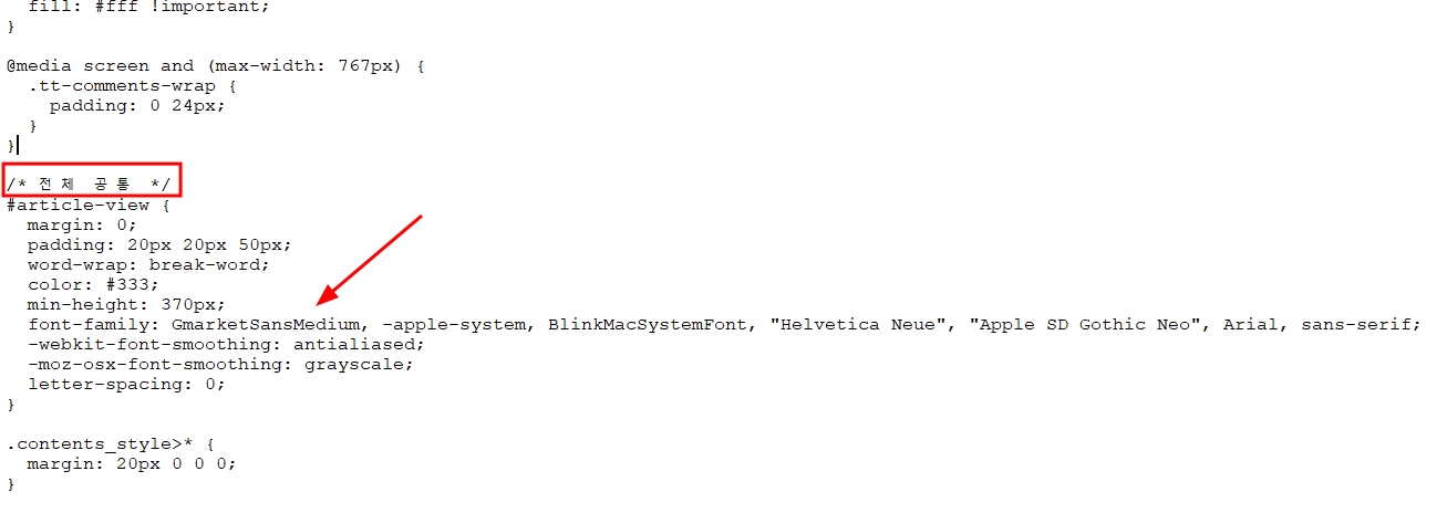 ⅲ. 메모장에서 '단어 찾기'를 이용해서 '전체공통' 부분을 찾습니다. 거기에서 'font-family'란에 내가 넣고 싶은 폰트체를 넣어 줍니다. 혹시나 해서 자세히 설명을 붙이자면
