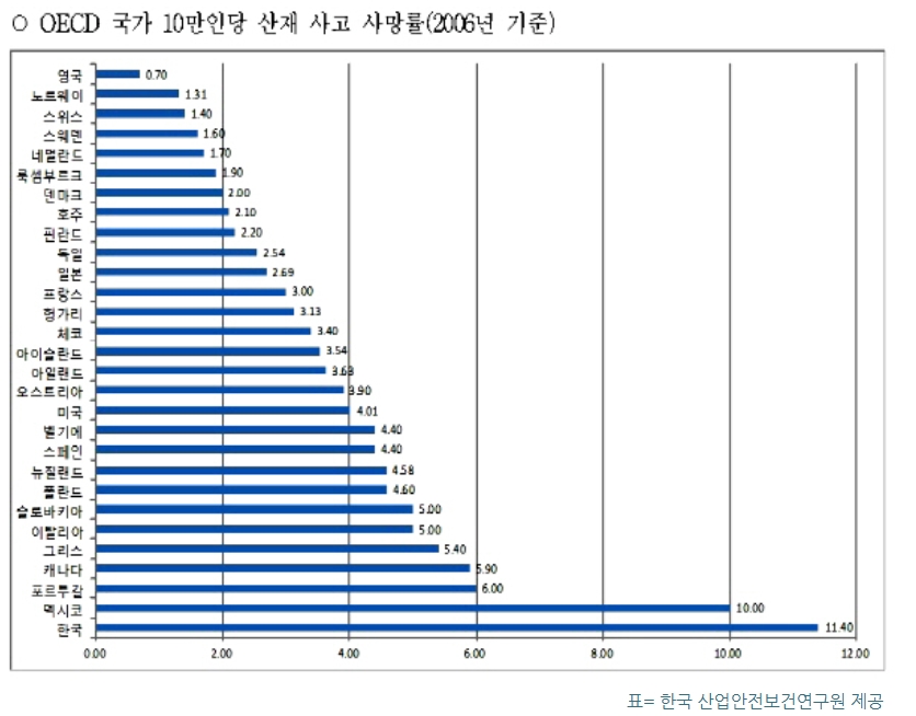 ↑↑ 도표를 보면 2006년도 좀 오래되기는 했지만 우리나라 순위를 한번 보세요. 꼴찌입니다. 지금은 의식이 많이 좋아졌다 해도 한해 2천 명이 넘는 사람들이 일터에서 목숨을 잃거나 병을 얻는다고 하니 우리의 무지가 참 부끄럽기도 합니다.