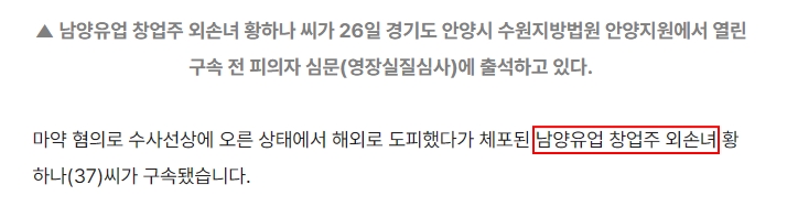 남양유업 창업주는 홍두영 회장님이시죠. 홍 회장님 막내딸 홍영혜 씨 첫째가 황하나 씨입니다. 남양유업에서도 밝혔듯이 홍영혜 씨는 창업주의 딸일 뿐이고 경영에는 아무런 관련이 없는 인물입니다. 남양유업에 종사하는 분들은 무슨 죄입니까? 이런 얘기까지 하기는 그렇지만 황하나 씨 큰외삼촌이랑 교류가 없는지 20년이 넘었다고 하는데 창업주 외손녀라는 이유 하나만으로 너무 많은 분들이 상처를 받는다는 겁니다.