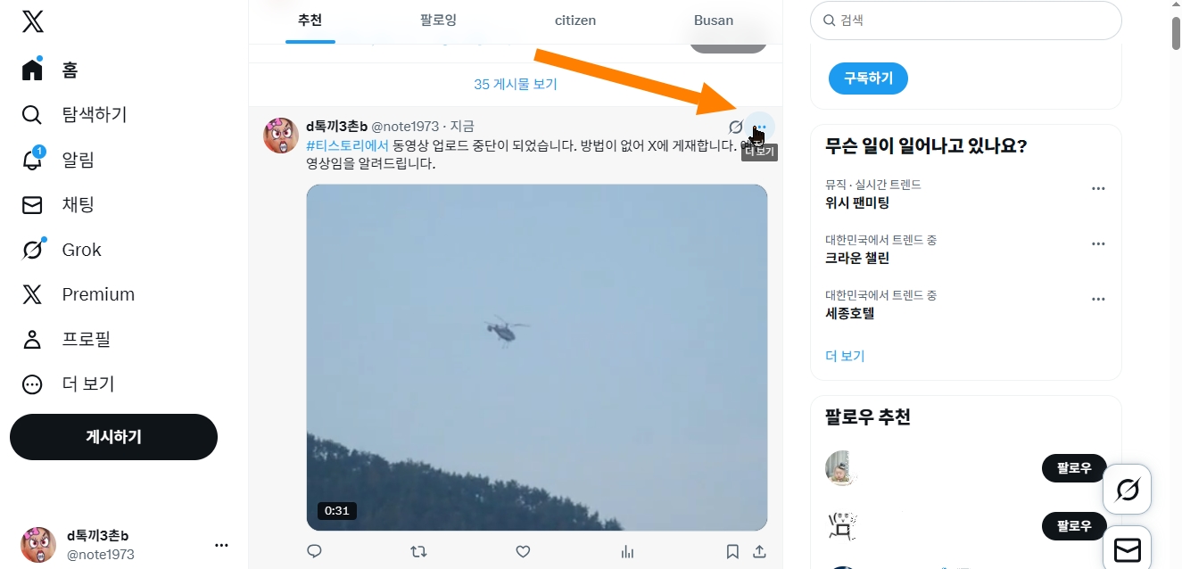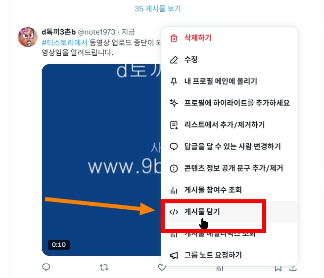 ↑↑ 영상을 X에 올리세요. 참고로 올리고 나서 바로 코드가 만들어지지 않습니다.. 조금 기다려주셔야 합니다. 올린 영상을 보면 우측 상단에 점 세 개를 클릭합니다.