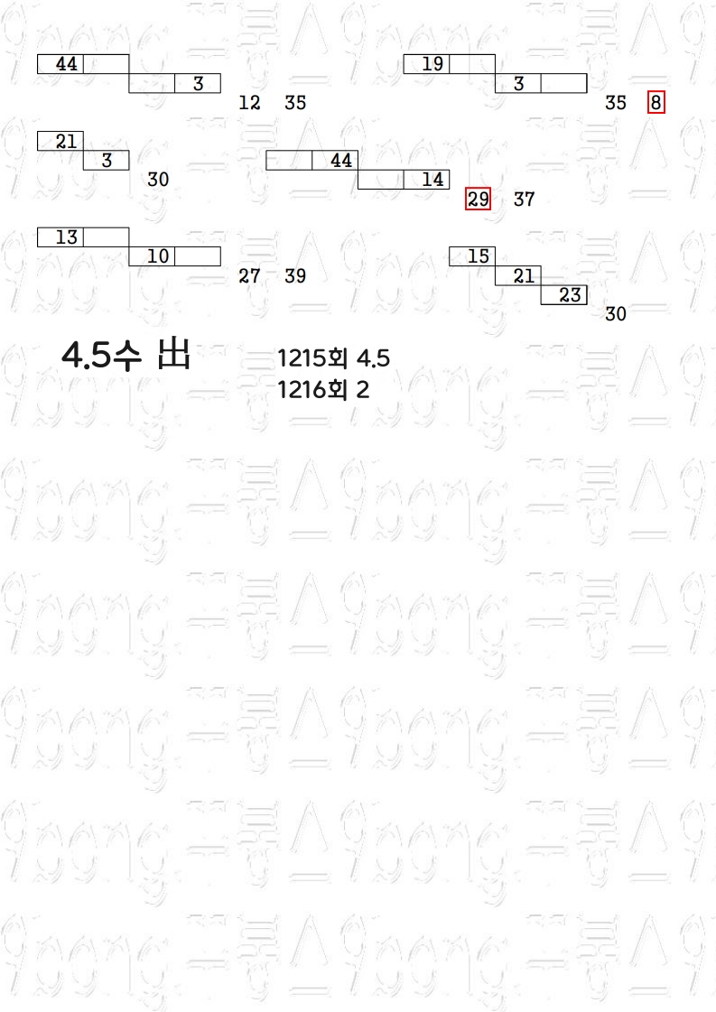 ♥ 초창기 멤버들에게만 20 조합을 보내줍니다. 역대 결과물을 보면 4등만 가끔 나옵니다. 그냥 참고만 하세요.1217회 유료 조합 결과물 1218회 예상수(계단파)㈜ 권장해상도 태블릿 PC, PC화면 (스마